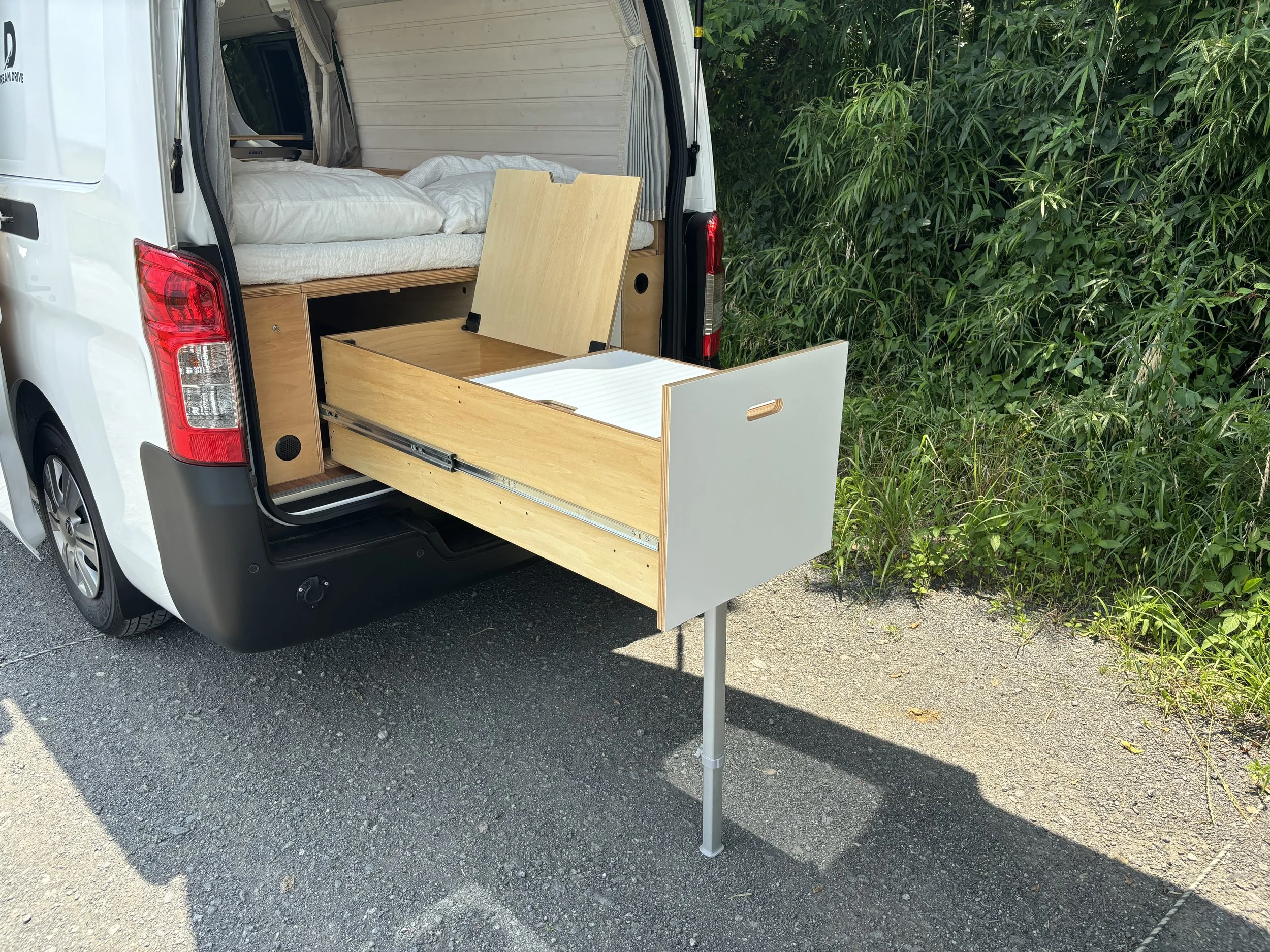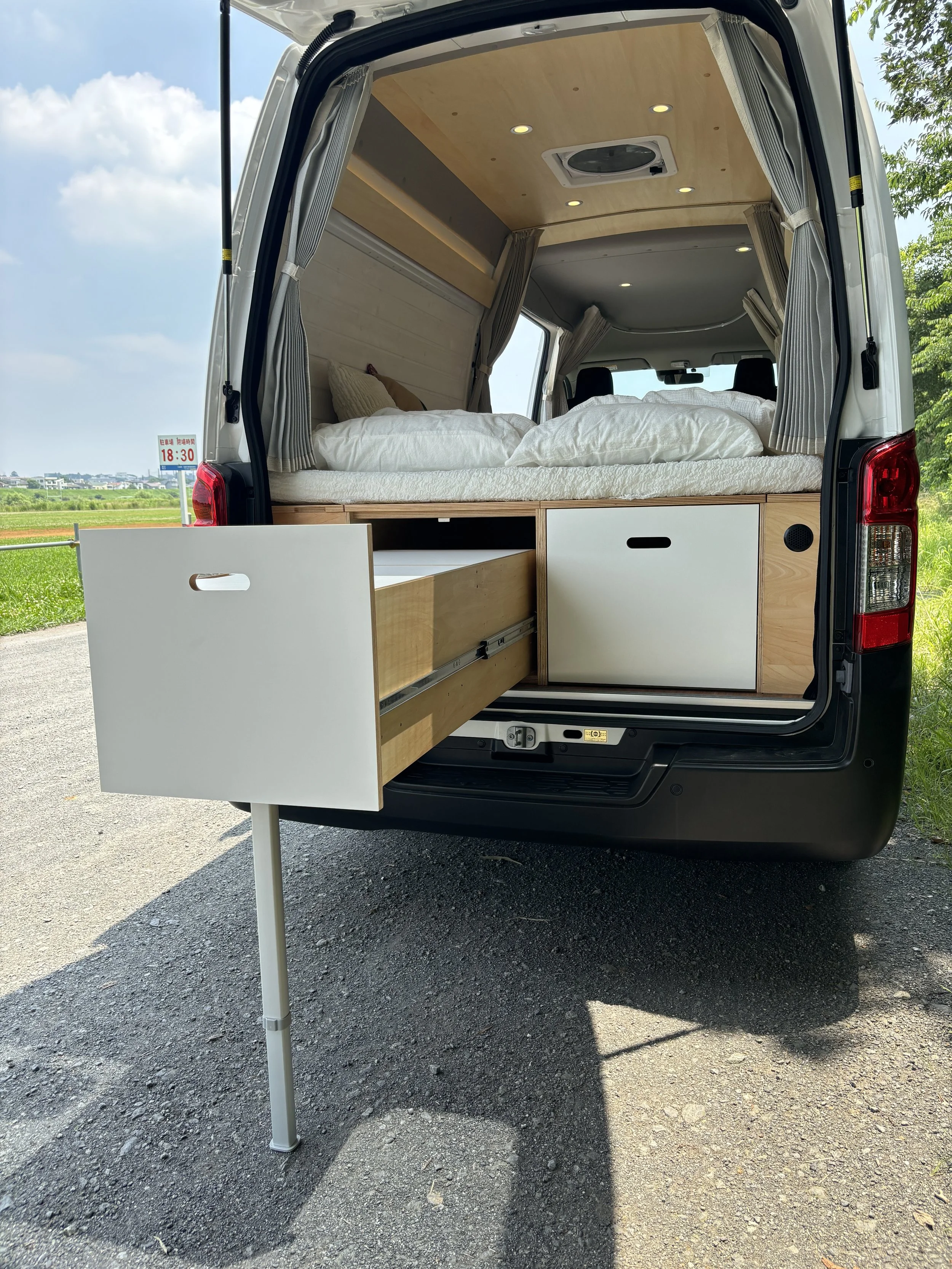 For those planning longer term travel and who are looking for a more comfortable bed to come back to, We install a full size double bed, and have two large slide out storage drawers so you can easily access all your gear. There is an internal slider for a fridge or toilet.
