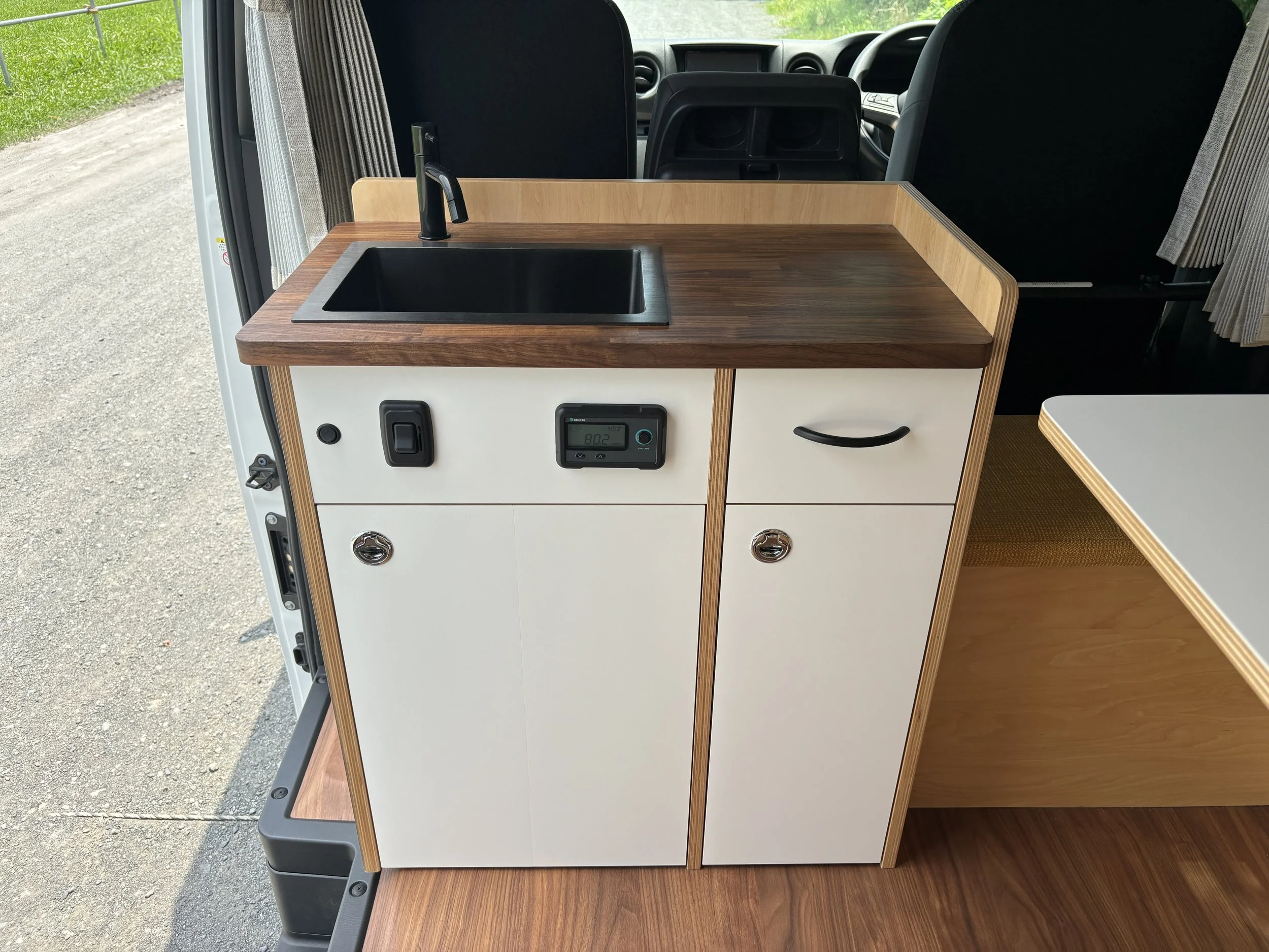 The Kitchen includes a sink and a shower attachment, storage and a 40L engel fridge which is built into the top with a beautiful walnut countertop. The fresh and grey tanks are also stored in the unit, We either install a 10L fresh/ 10L grey and a sink or a 40L fresh tank with a facet on top which would be used with a portable sink.